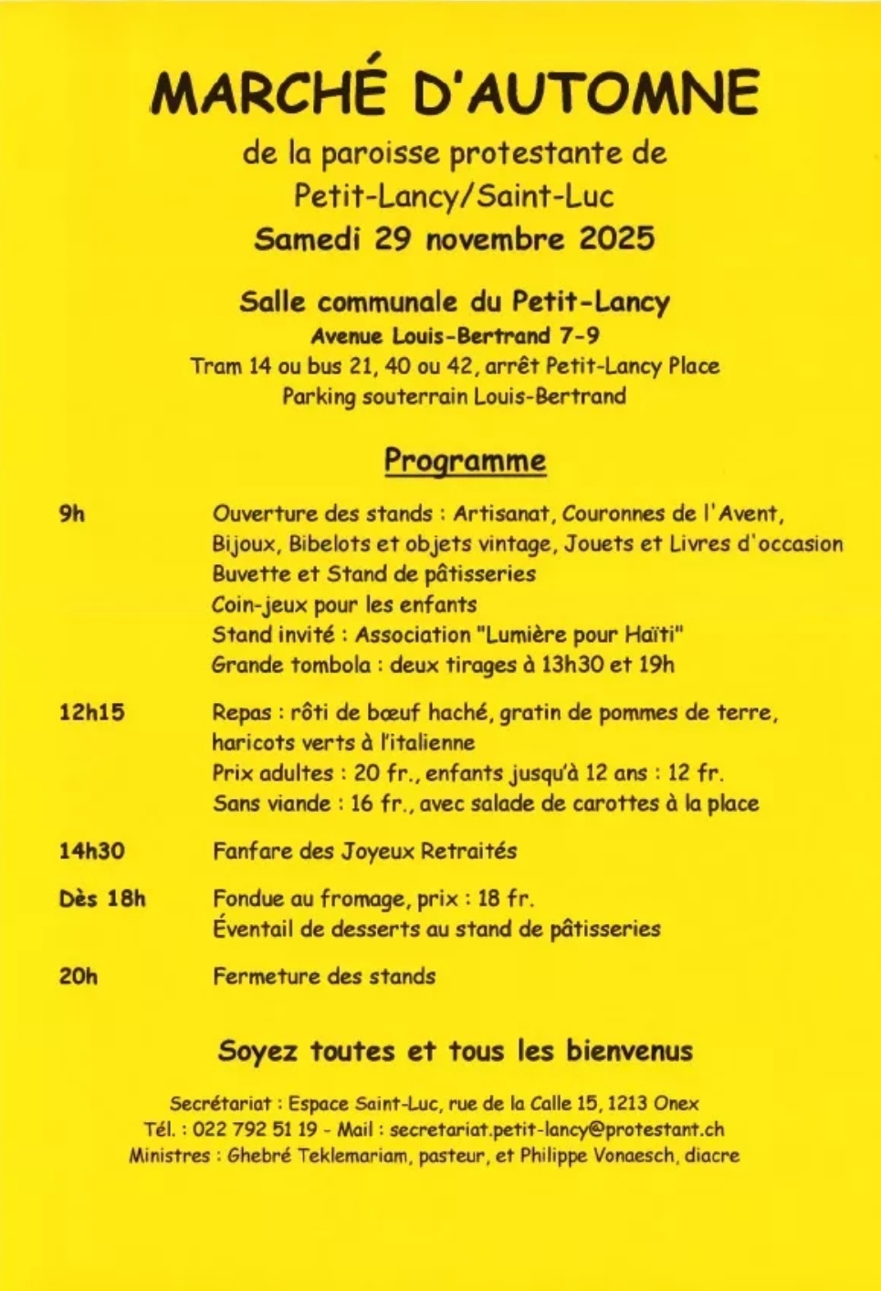 | 29-11-2025 | 14h30 | Kermesse de la paroisse St-Luc | Salle communale du Petit Lancy | Public |