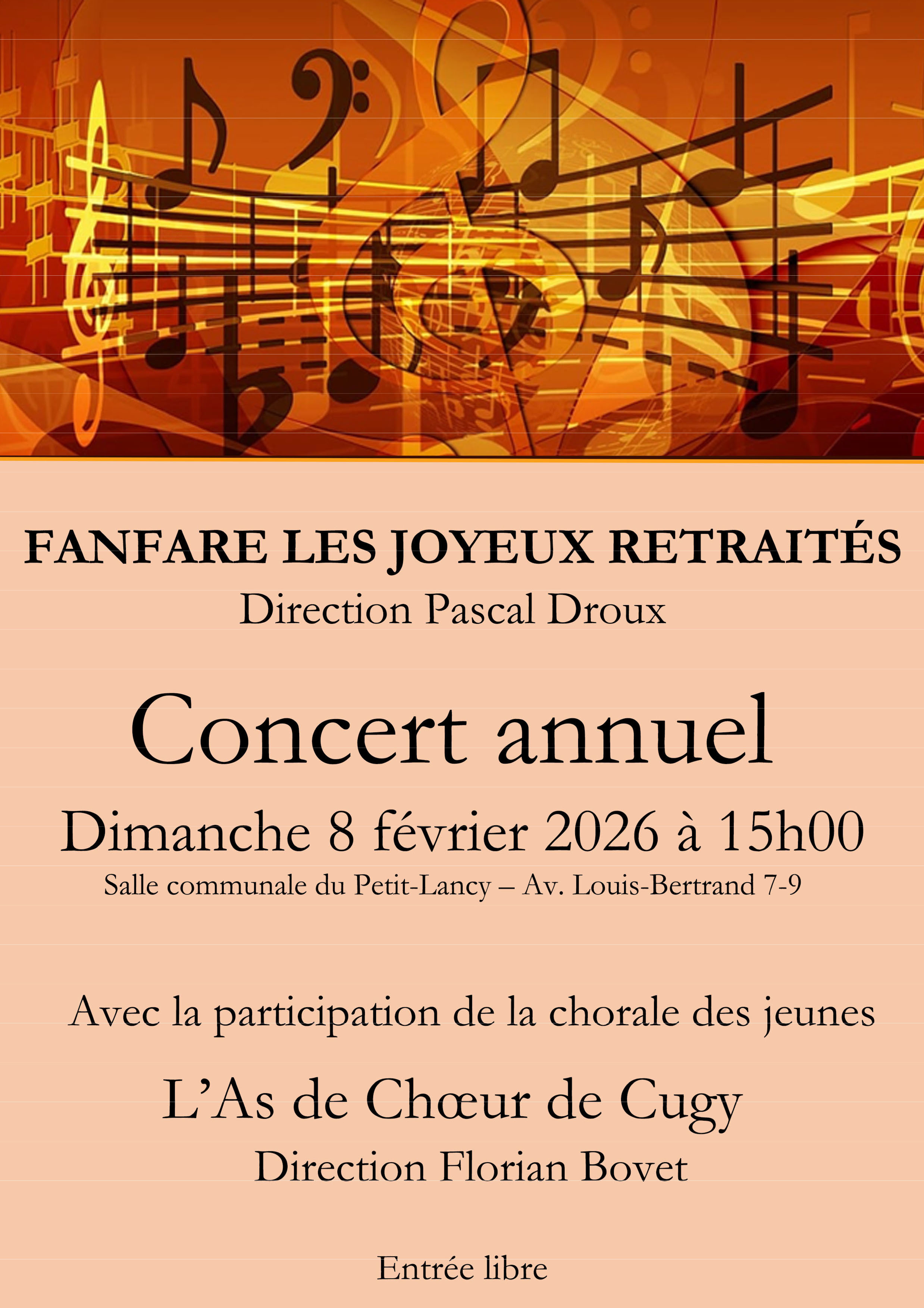 | 08-02-2026 | 15h00 | Concert annuel | Salle communale du Petit-Lancy | Public |